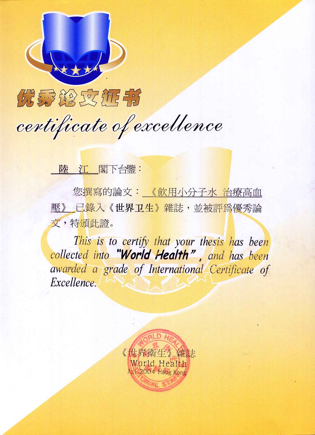 《飲用小分子水治療高血脂》獲優(yōu)秀論文獎(jiǎng)