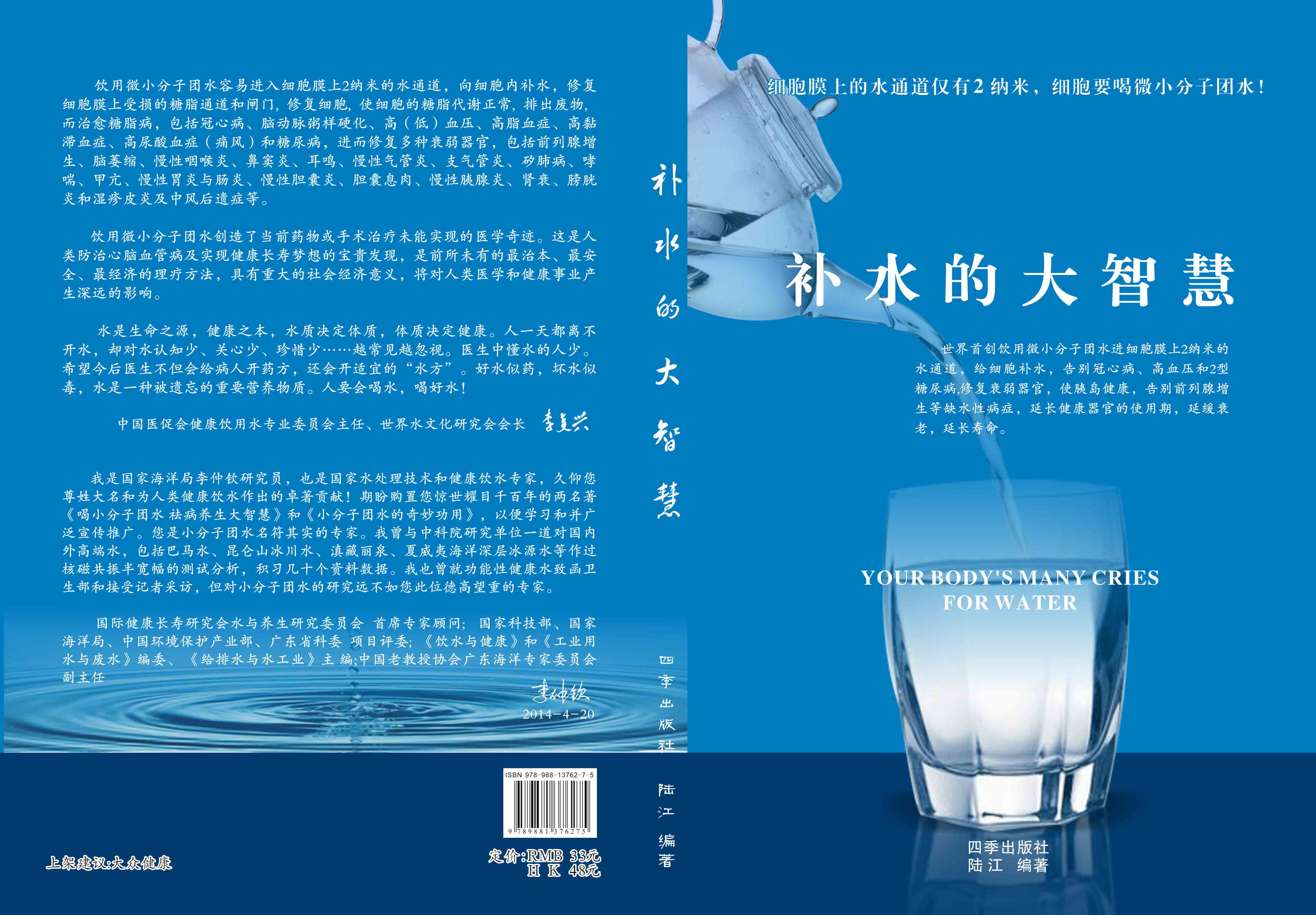 4. 陸 江新編著《延命水》一書,全彩色印刷A4內(nèi)頁(yè)P(yáng)240 ;2014年由香港出版的《補(bǔ)水的大智慧》一書,全彩色印刷16K內(nèi)頁(yè)P(yáng)218,郵購(gòu)贈(zèng)此書,均送光盤。