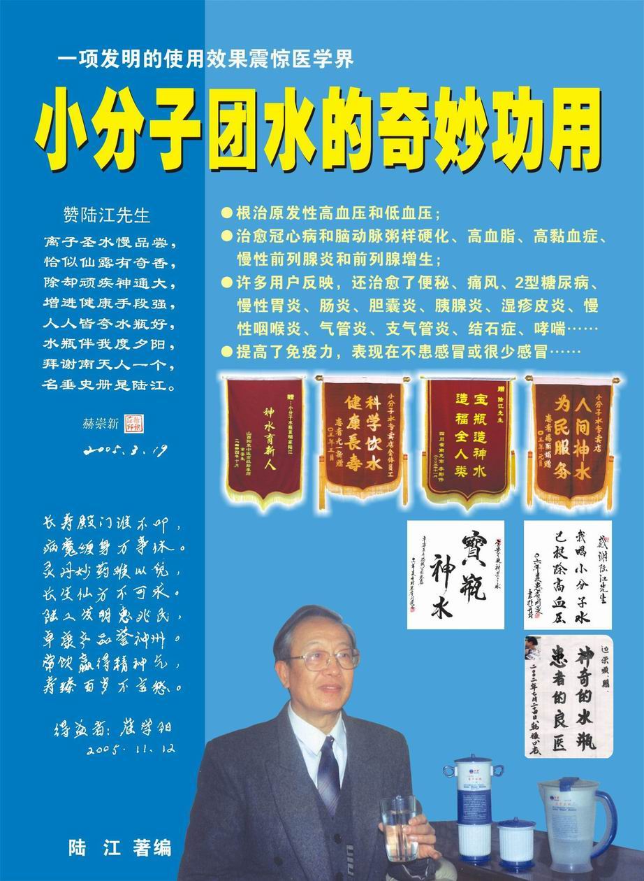 人類幾千年來(lái)患以上病癥需終生服藥,幾十年也不能治愈。可是我國(guó)南寧的高級(jí)工程師陸 江,于1990年想根治高血壓,研究發(fā)明了離子水瓶,處理出微小分子團(tuán)水供飲用,經(jīng)過(guò)醫(yī)院臨床試用和專家鑒定,1999年獲中國(guó)發(fā)明專利權(quán),產(chǎn)品于2000年投放市場(chǎng)后一直跟蹤調(diào)查,據(jù)全國(guó)各地用戶反饋:祛除了高低血壓、糖尿病和冠心病,并使前列腺增生、咽喉炎、鼻竇炎、慢性氣管炎、支氣管炎、矽肺病、哮喘、慢性胃炎、腸炎、慢性膽囊炎、慢性腎炎、腎衰、膀胱炎、便秘、痔瘡、風(fēng)濕性關(guān)節(jié)炎和濕疹皮炎及中風(fēng)后遺癥等病癥不藥而愈。為什么喝微小水能治20多種病?陸 江從1991年德國(guó)科學(xué)家發(fā)現(xiàn)細(xì)胞膜水通道僅為2納米獲得啟發(fā),認(rèn)為多種器官患病是因細(xì)胞脫水,不能正常代謝和分裂增殖,才使器官細(xì)胞減少致衰弱萎縮而形成細(xì)胞缺水性病癥。22年來(lái)的實(shí)踐有力地支持了“細(xì)胞脫水致病”這一重要論點(diǎn),表明喝微小水可滿足細(xì)胞的生理需求,補(bǔ)水就能祛病,是生命科學(xué)新亮點(diǎn)。