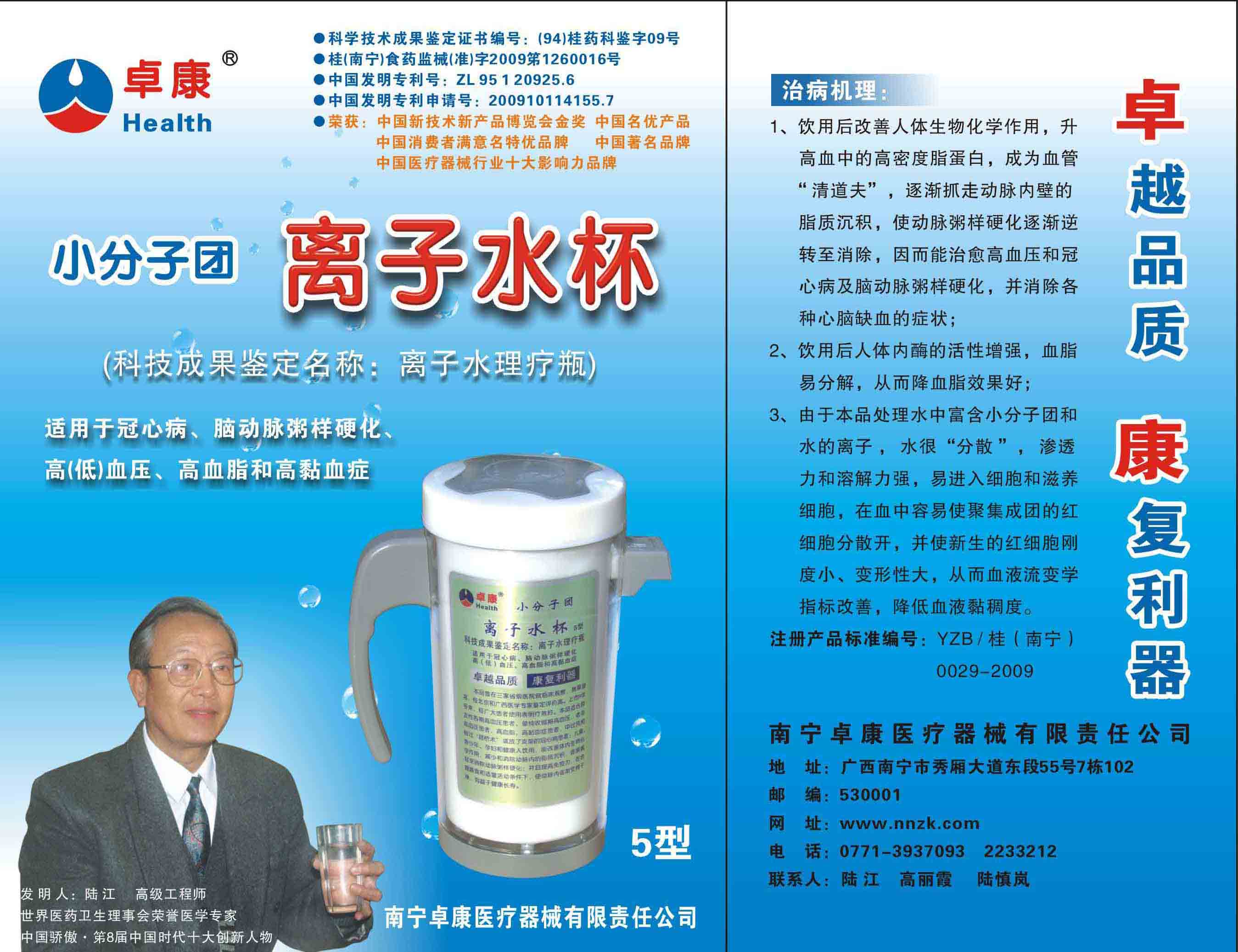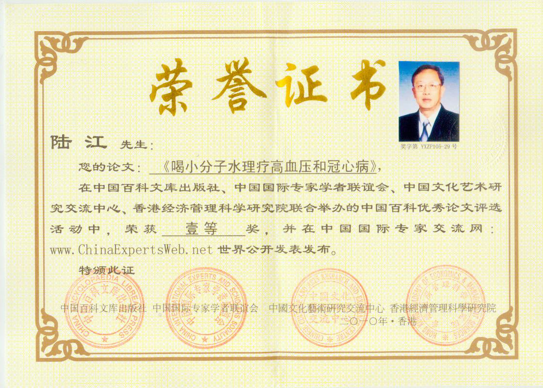 -----我是從事建筑的高工,本來(lái)沒(méi)有資格去攻克醫(yī)學(xué)難題,卻為了自身健康才扣響醫(yī)學(xué)的大門。由于我1990年患高血壓,因怕中風(fēng)才研究發(fā)明了離子水瓶,我把水處理成微小分子團(tuán)水,飲用后治愈了高血壓。便于1993年底送到三家省級(jí)醫(yī)院做臨床試用4個(gè)月。經(jīng)北京和廣西醫(yī)學(xué)專家鑒定:"降脂降壓效果好"," 能擴(kuò)大心腦動(dòng)脈流量,改善心腦電圖以及微循環(huán)","對(duì)治療心腦動(dòng)脈粥樣硬化、高血壓、高血脂有良好的醫(yī)療保健作用。""產(chǎn)品的技術(shù)性能和療效達(dá)到了同類產(chǎn)品的國(guó)內(nèi)領(lǐng)先水平,經(jīng)廣西醫(yī)學(xué)科學(xué)情報(bào)研究所檢索,未見(jiàn)國(guó)外有類似報(bào)道。"中國(guó)醫(yī)學(xué)科學(xué)院張正國(guó)教授從美國(guó)國(guó)立醫(yī)學(xué)圖書館數(shù)據(jù)庫(kù)存Medline檢索英俄文資料,均未見(jiàn)類似報(bào)告。2000年上市后,我為了對(duì)消費(fèi)者負(fù)責(zé)而繼續(xù)觀察研究,一直通過(guò)《信譽(yù)卡》和《質(zhì)量跟蹤調(diào)查書》向患者承諾療效,請(qǐng)用戶使用6個(gè)月后反饋效果。和脂壓患者飲用2至5個(gè)月內(nèi),消除癥狀,停服藥物,血壓正常;冠心病患者飲用3~5個(gè)月逐漸減輕至消除心絞痛、房顫等癥狀,不再服藥,飲用1年左右心電圖正常,經(jīng)冠脈造影掃描無(wú)明顯狹窄,表明冠心病痊愈。大量患者還反映許多衰弱器官被修復(fù),讓前列腺增生、慢性咽喉炎、慢性氣管炎、支氣管炎、慢性胃炎、腸炎和膽囊炎等不藥而愈;2型糖尿病患者是因?yàn)橐葝u衰弱致病,飲用該水半年至一年,逐漸減藥至停藥,血糖尿糖正常,真正治愈2型糖尿病。中風(fēng)后遺癥患者飲用六七個(gè)月,可逐漸減輕至消除肢體和語(yǔ)言障礙,表明飲用該水能讓壽命很長(zhǎng)的神經(jīng)元細(xì)胞逐漸修復(fù),奇跡般地恢復(fù)肢體和語(yǔ)言功能。飲用后還使胸腺和脾臟兩個(gè)重要的免疫器官被修復(fù)和增強(qiáng),產(chǎn)生免疫細(xì)胞多,提高了免疫力,使人不生病或少生病。自此, 飲用微小分子團(tuán)水創(chuàng)造了攻克冠心病、高(低)血壓和糖尿病三大醫(yī)學(xué)難題的奇跡。人們對(duì)此感到不可思議,但實(shí)踐是檢驗(yàn)真理的唯一標(biāo)準(zhǔn)。