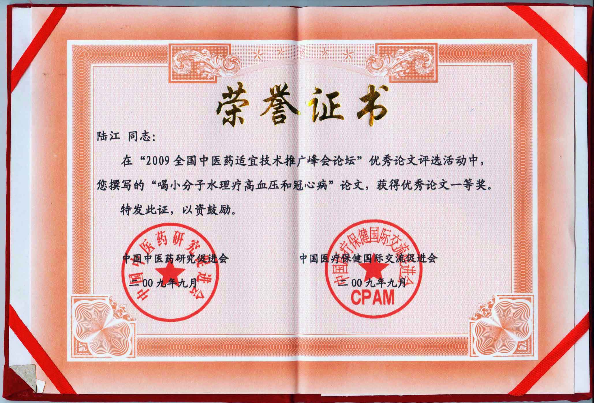 陸江的論文獲一等獎(jiǎng)榮譽(yù)證書-- 陸江論文獲創(chuàng)新論文獎(jiǎng)牌
